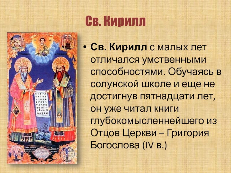 Св. КириллСв. Кирилл с малых лет отличался умственными способностями. Обучаясь в солунской школе и еще не достигнув