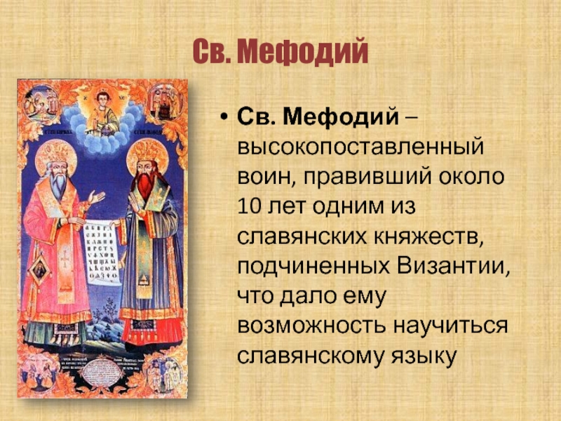 Св. МефодийСв. Мефодий – высокопоставленный воин, правивший около 10 лет одним из славянских княжеств, подчиненных Византии, что