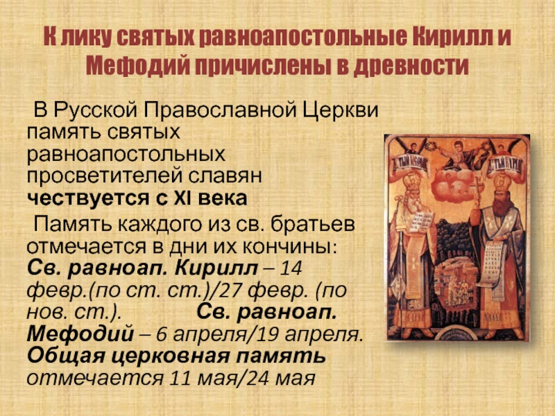 Слайд 3День памяти первоучителей славянских народов – святых равноапостольных братьев Кирилла