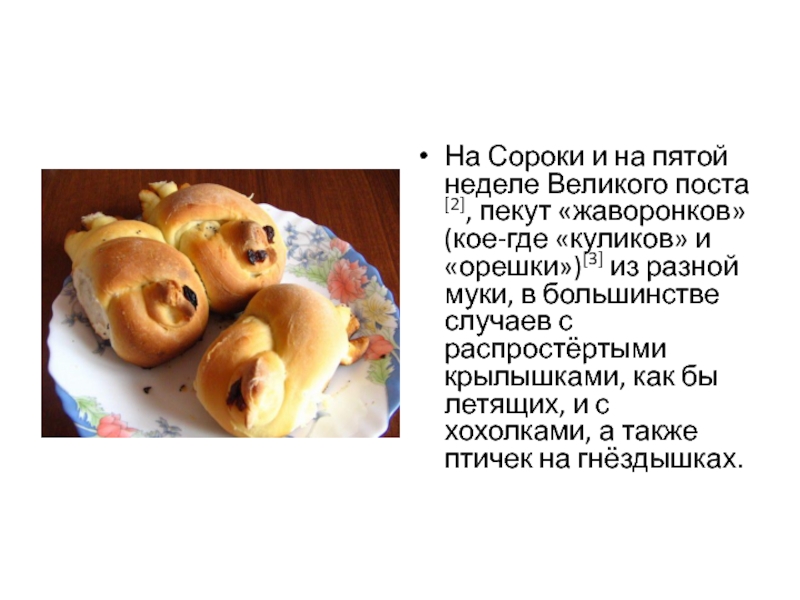 Слайд 8На Сороки и на пятой неделе Великого поста[2], пекут «жаворонков»