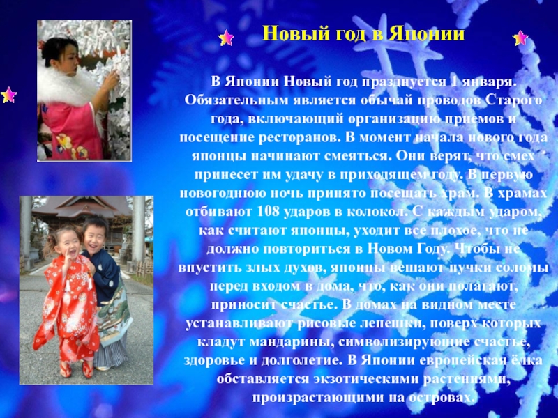 посещение ресторанов. В момент начала нового года японцы начинают смеяться. Они верят, что смех принесет им удачу в приходящем году. В первую новогоднюю ночь принято посещать храм. В храмах отбивают 108 ударов в колокол. С каждым ударом, как считают японцы, уходит все плохое, что не должно повториться в Новом Году. Чтобы не впустить злых духов, японцы вешают пучки соломы перед входом в дома, что, как они полагают, приносит счастье. В домах на видном месте устанавливают рисовые лепешки, поверх которых кладут мандарины, символизирующие счастье, здоровье и долголетие. В Японии европейская ёлка обставляется экзотическими растениями, произрастающими на островах.
