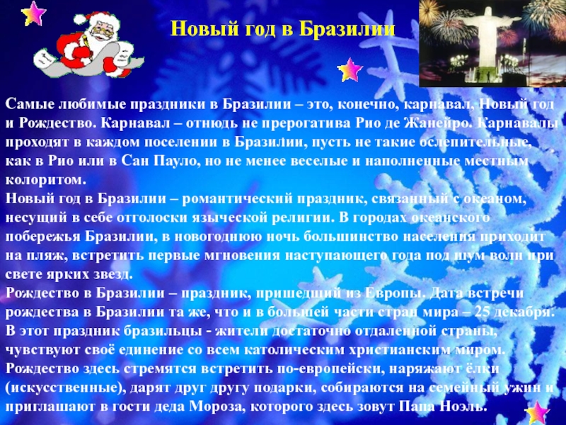 Новый год в Бразилии – романтический праздник, связанный с океаном, несущий в себе отголоски языческой религии. В городах океанского побережья Бразилии, в новогоднюю ночь большинство населения приходит на пляж, встретить первые мгновения наступающего года под шум волн при свете ярких звезд.