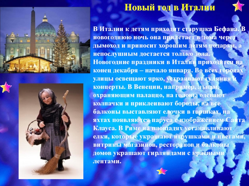приносит хорошим детям подарки, а непослушным достается только зола. Новогодние праздники в Италии приходятся на конец декабря – начало января. Во всех городах улицы освещают ярко, устраивают гуляния и концерты. В Венеции, например, львам, охраняющим палаццо, на головы одевают колпачки и приклеивают бороды, на все балконы выставляют елочки в горшках, на яхтах появляются паруса с изображением Санта Клауса. В Риме на площадях устанавливают елки, которые украшают игрушками и цветами, витрины магазинов, ресторанов и балконы домов украшают гирляндами с красными лентами.