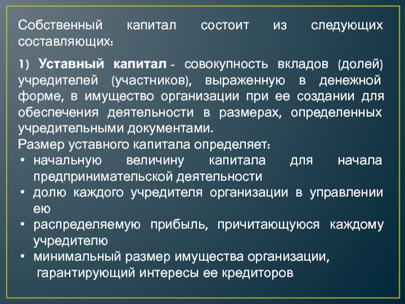 Слайд 12Собственный капитал состоит из следующих составляющих:
