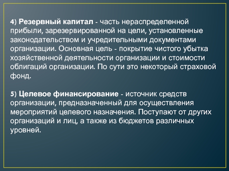 Слайд 144) Резервный капитал - часть нераспределенной прибыли, зарезервированной на цели, установленные
