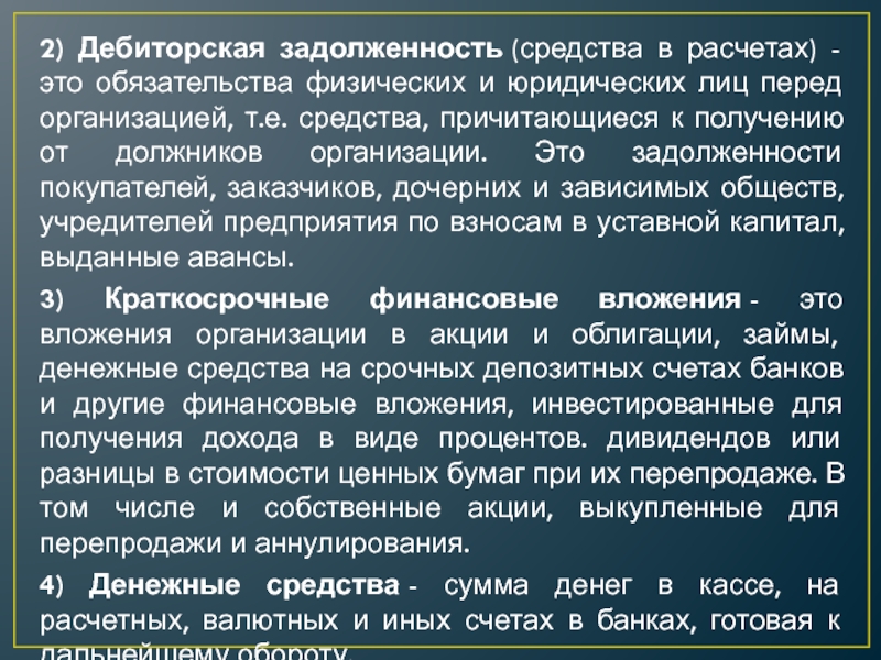 Слайд 92) Дебиторская задолженность (средства в расчетах) - это обязательства физических и