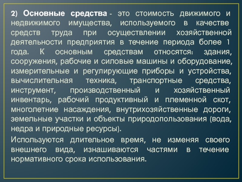 течение периода более 1 года. К основным средствам относятся: здания, сооружения, рабочие и силовые машины и оборудование, измерительные и регулирующие приборы и устройства, вычислительная техника, транспортные средства, инструмент, производственный и хозяйственный инвентарь, рабочий продуктивный и племенной скот, многолетние насаждения, внутрихозяйственные дороги, земельные участки и объекты природопользования (вода, недра и природные ресурсы).