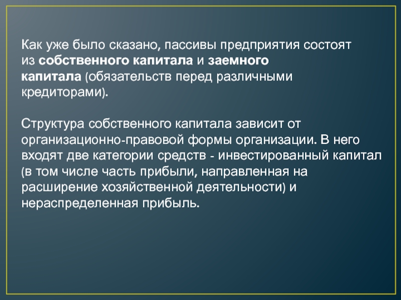 Слайд 11Как уже было сказано, пассивы предприятия состоят из собственного капитала и заемного капитала (обязательств