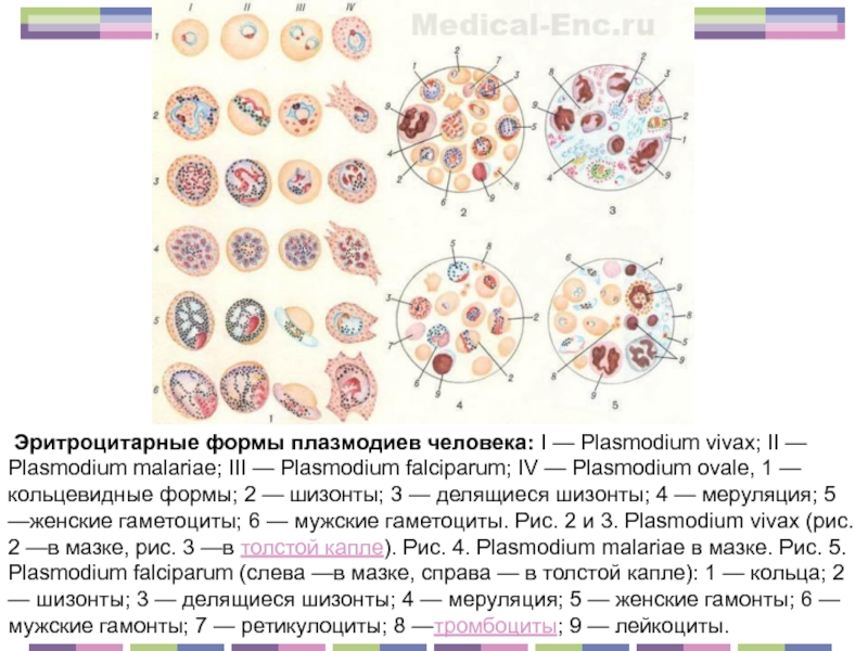 1 — кольцевидные формы; 2 — шизонты; 3 — делящиеся шизонты; 4 — меруляция; 5 —женские гаметоциты; 6 — мужские гаметоциты. Рис. 2 и 3. Plasmodium vivax (рис. 2 —в мазке, рис. 3 —в толстой капле). Рис. 4. Plasmodium malariae в мазке. Рис. 5. Plasmodium falciparum (слева —в мазке, справа — в толстой капле): 1 — кольца; 2 — шизонты; 3 — делящиеся шизонты; 4 — меруляция; 5 — женские гамонты; 6 — мужские гамонты; 7 — ретикулоциты; 8 —тромбоциты; 9 — лейкоциты.