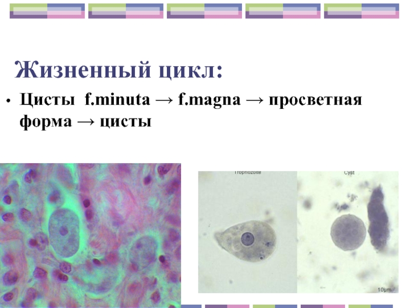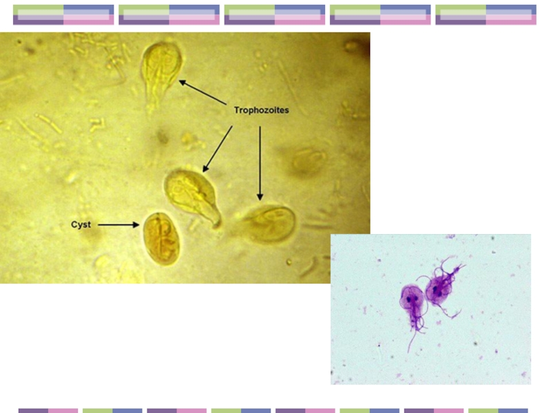 цисты, которые различают по размеру и числу ядер. Мазок микроскопируют