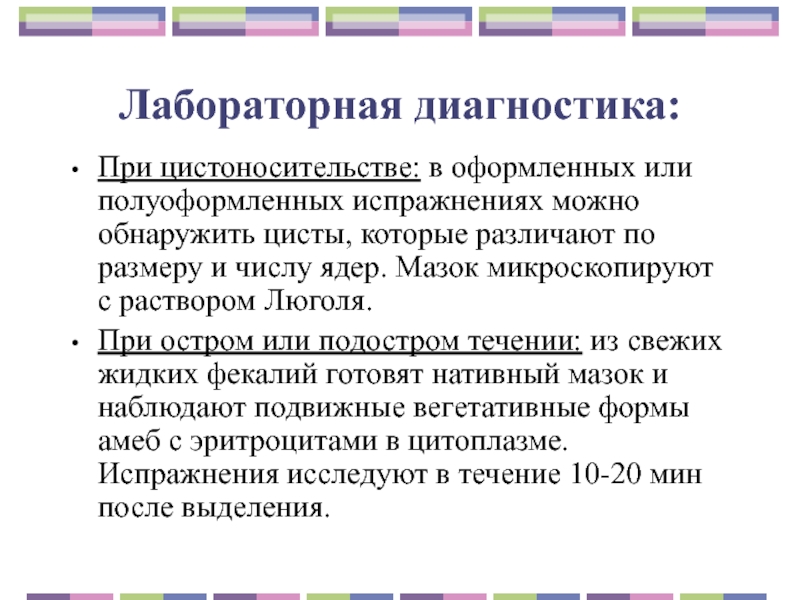 При остром или подостром течении: из свежих жидких фекалий готовят нативный мазок и наблюдают подвижные вегетативные формы амеб с эритроцитами в цитоплазме. Испражнения исследуют в течение 10-20 мин после выделения.
