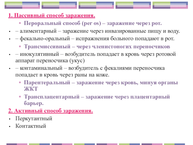 Парентеральный – заражение через кровь, минуя органы ЖКТ