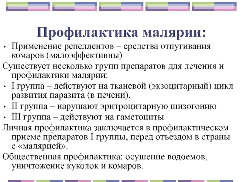 Личная профилактика заключается в профилактическом приеме препаратов I группы, перед отъездом в страны с «малярией».