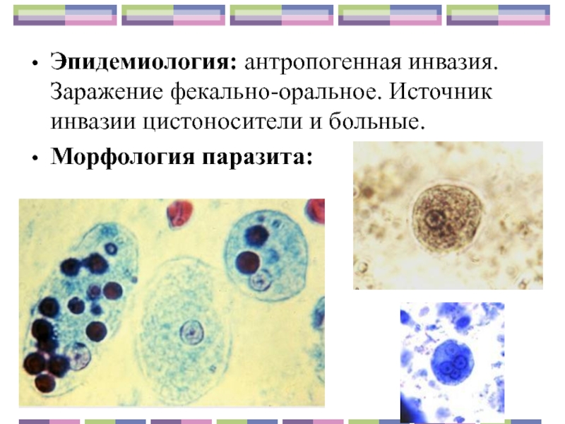 Слайд 14Эпидемиология: антропогенная инвазия. Заражение фекально-оральное. Источник инвазии цистоносители и больные.