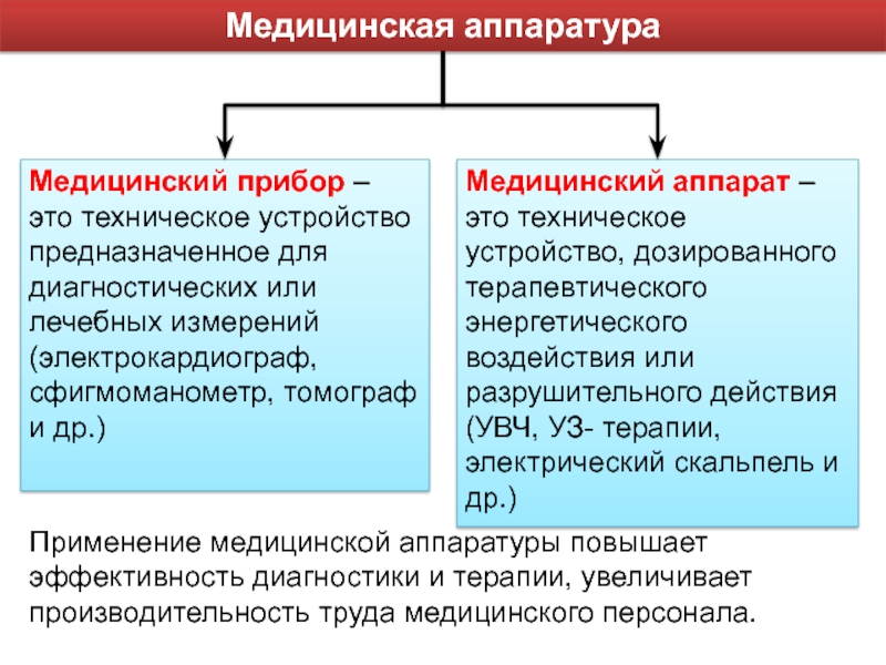 Применение медицинской аппаратуры повышает эффективность диагностики и терапии, увеличивает производительность труда медицинского персонала.