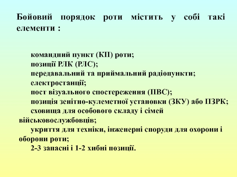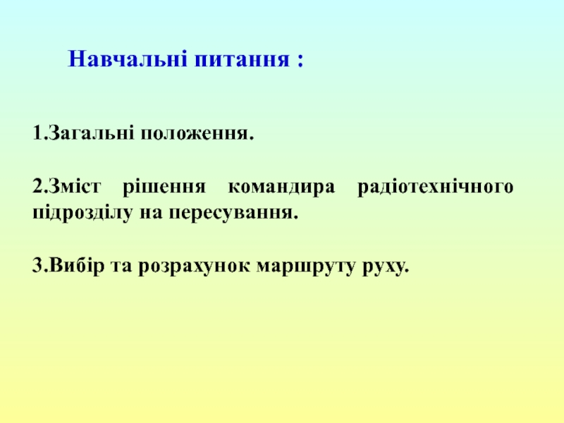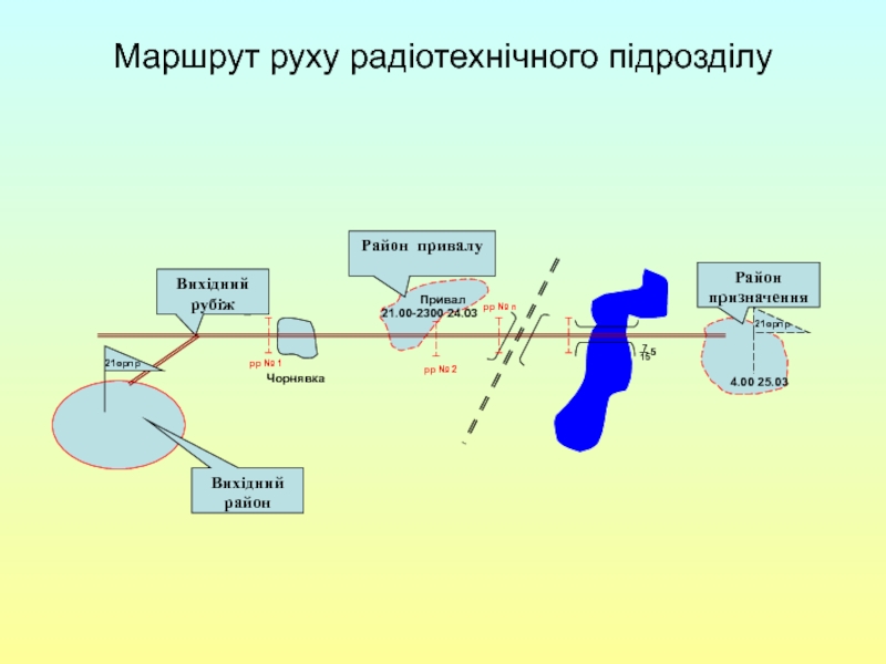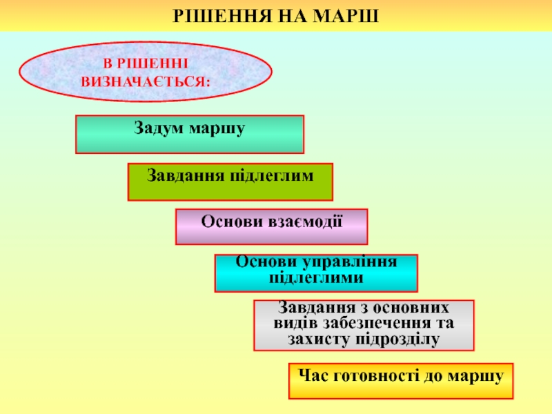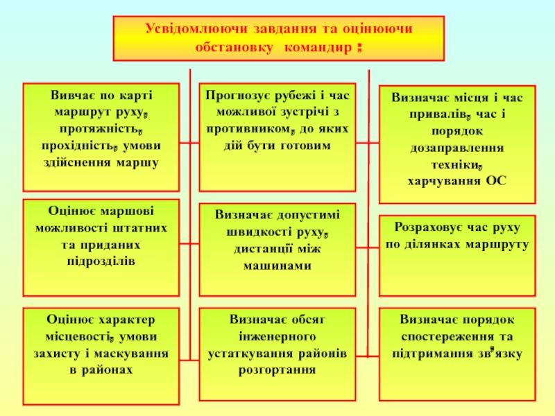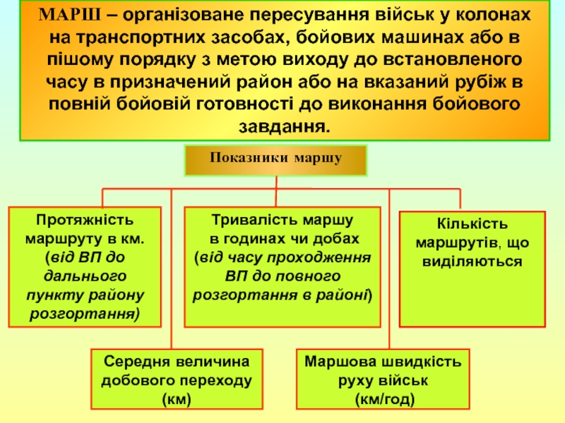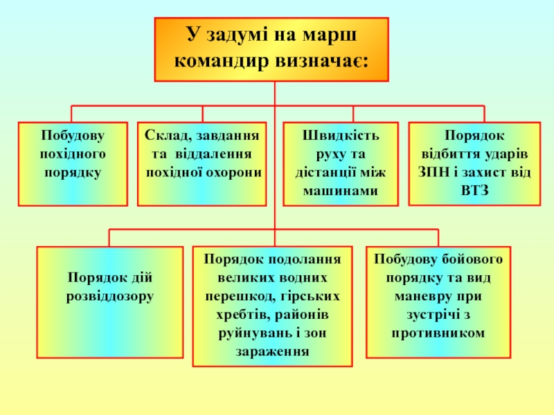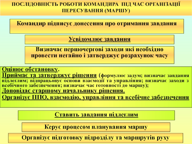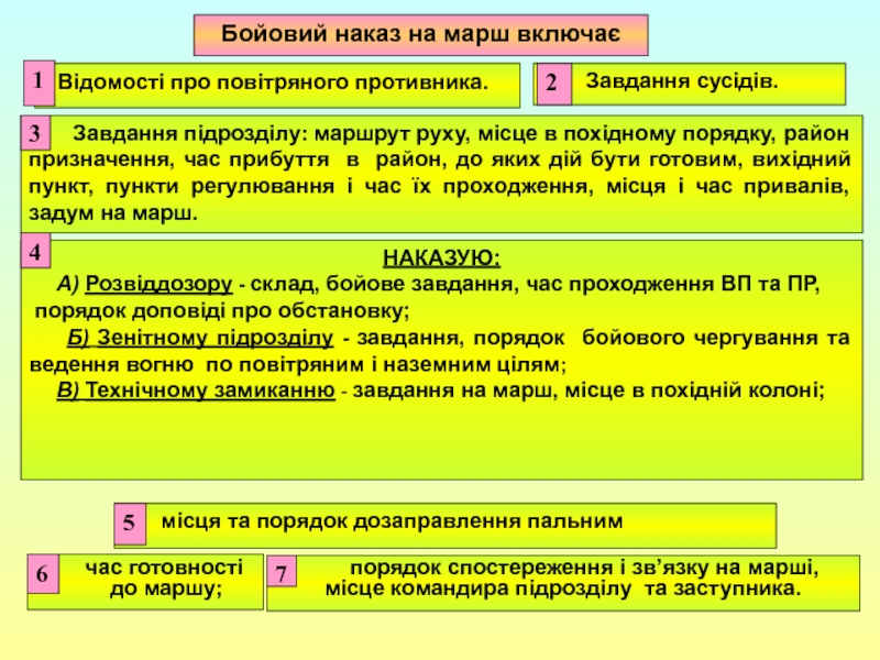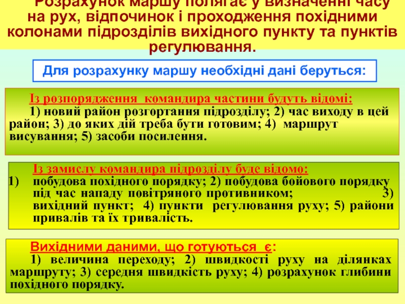 побудова похідного порядку; 2) побудова бойового порядку під час нападу повітряного противником; 3) вихідний пункт; 4) пункти регулювання руху; 5) райони привалів та їх тривалість.