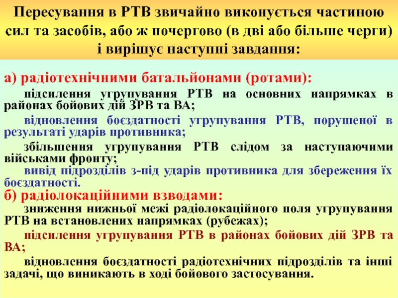 відновлення боєздатності радіотехнічних підрозділів та інші задачі, що виникають в ході бойового застосування.