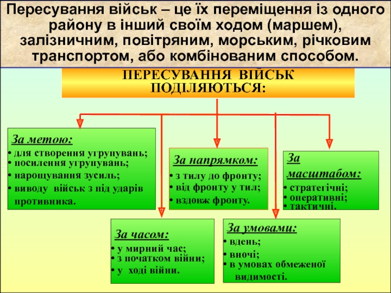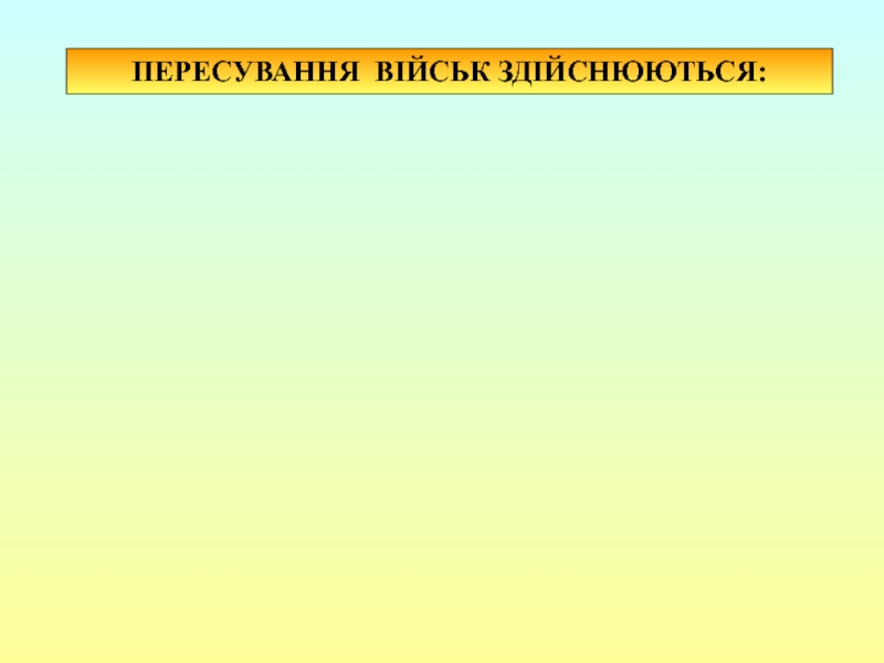Пересування військ – це їх переміщення із одного району в інший своїм ходом (маршем), залізничним, повітряним, морським, річковим транспортом, або комбінованим способом.