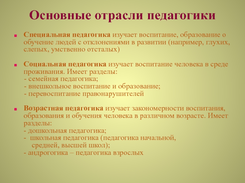 Возрастная педагогика изучает закономерности воспитания, образования и обучения человека в различном возрасте. Имеет разделы: