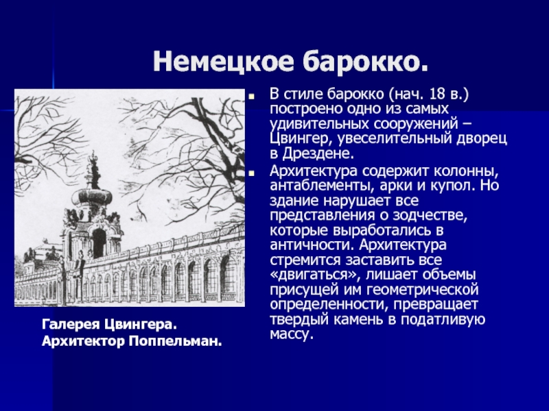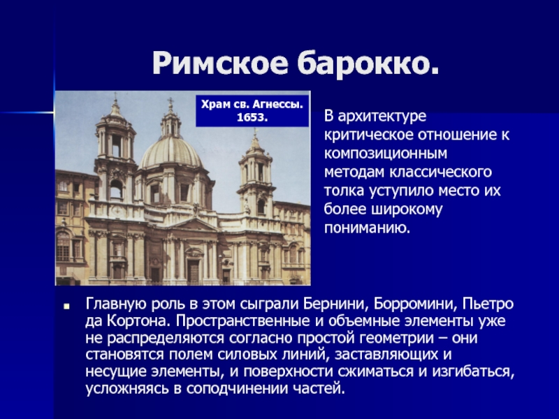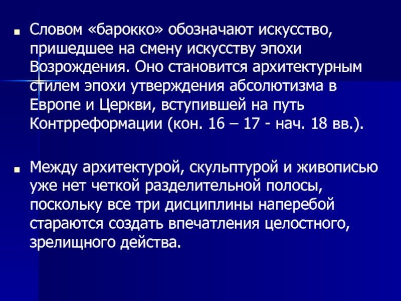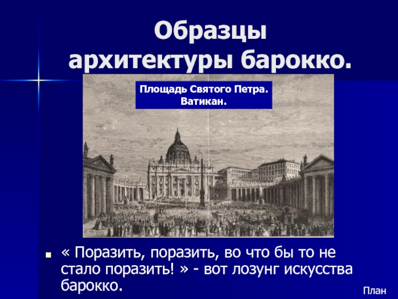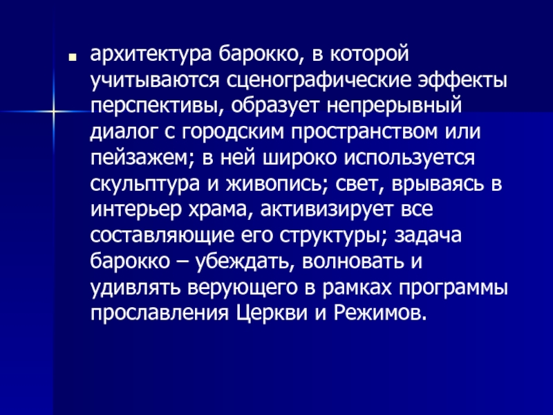 Слайд 38архитектура барокко, в которой учитываются сценографические эффекты перспективы, образует непрерывный