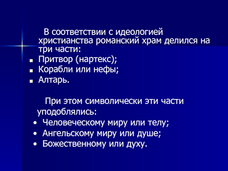В соответствии с идеологией христианства романский храм делился на три части: притвор, корабли или нефы и алтарь.