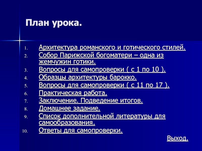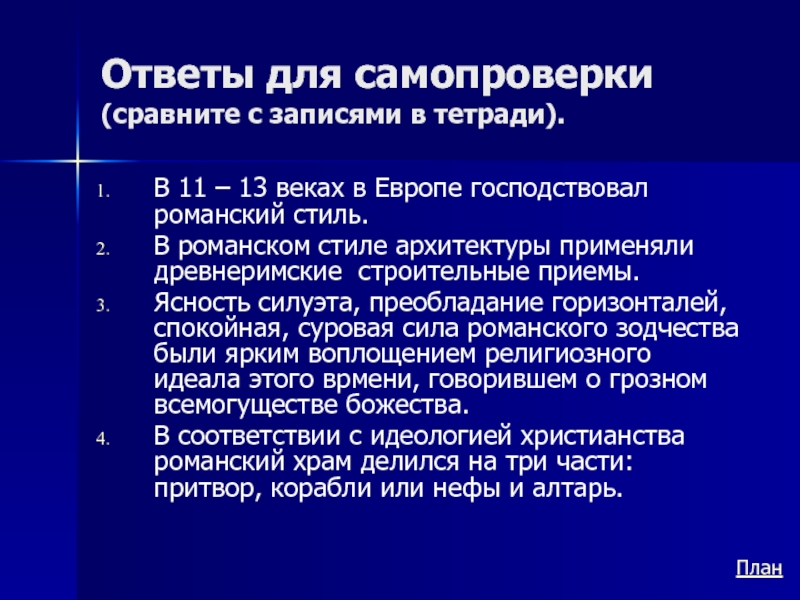 Ясность силуэта, преобладание горизонталей, спокойная, суровая сила романского зодчества были ярким воплощением религиозного идеала этого врмени, говорившем о грозном всемогуществе божества.