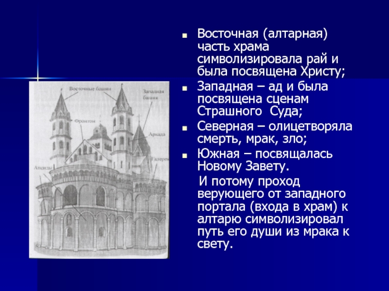 Слайд 8Восточная (алтарная) часть храма символизировала рай и была посвящена Христу;