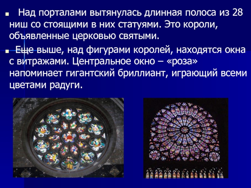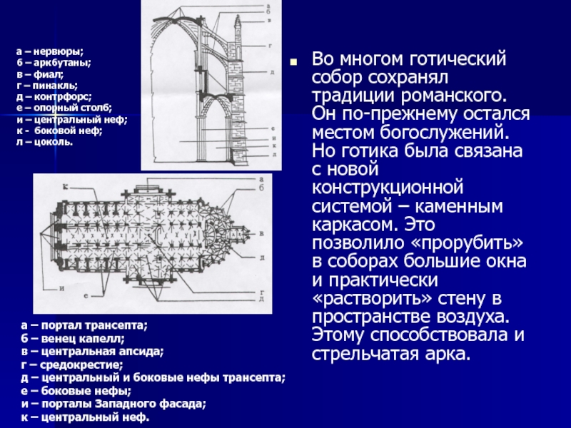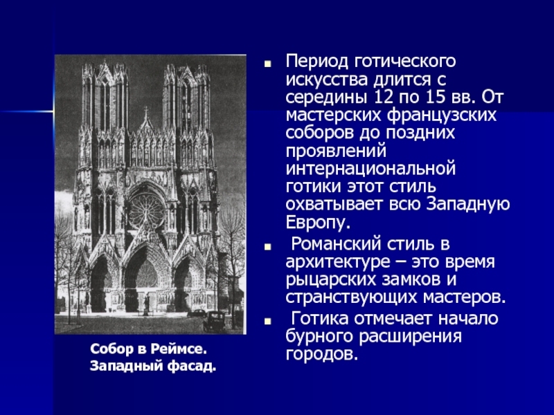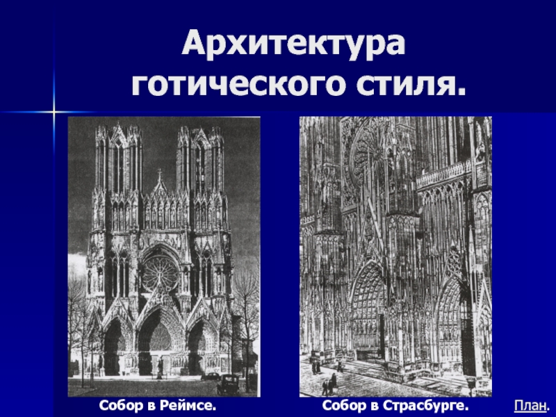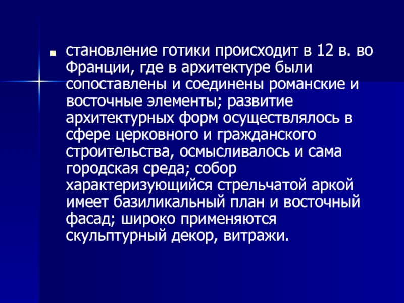 архитектурных форм осуществлялось в сфере церковного и гражданского строительства, осмысливалось и сама городская среда; собор характеризующийся стрельчатой аркой имеет базиликальный план и восточный фасад; широко применяются скульптурный декор, витражи.