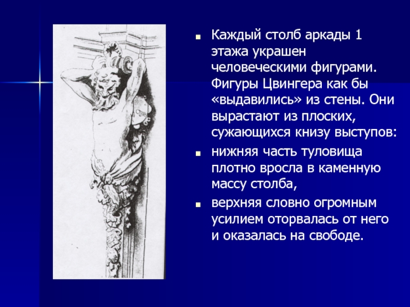 Слайд 32Каждый столб аркады 1 этажа украшен человеческими фигурами. Фигуры Цвингера