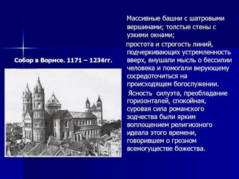 Ясность силуэта, преобладание горизонталей, спокойная, суровая сила романского зодчества были ярким воплощением религиозного идеала этого времени, говорившем о грозном всемогуществе божества.