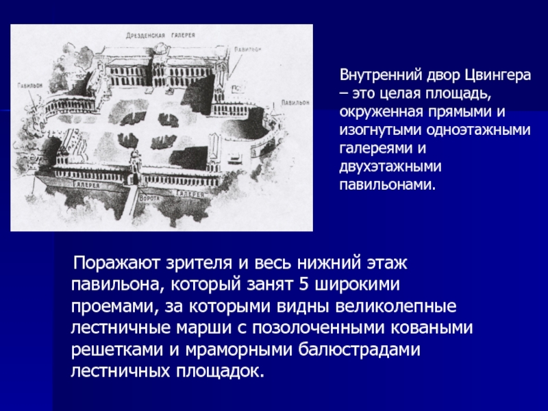 Внутренний двор Цвингера – это целая площадь, окруженная прямыми и изогнутыми одноэтажными галереями и двухэтажными павильонами.