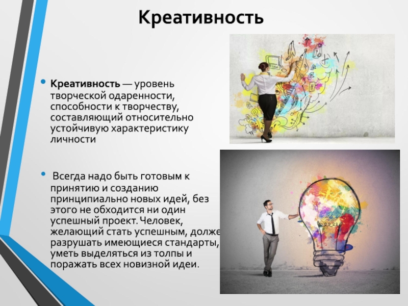 созданию принципиально новых идей, без этого не обходится ни один успешный проект. Человек, желающий стать успешным, должен разрушать имеющиеся стандарты, уметь выделяться из толпы и поражать всех новизной идеи.