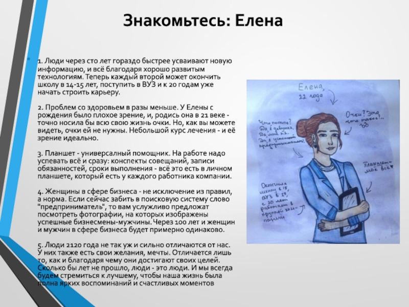 5. Люди 2120 года не так уж и сильно отличаются от нас. У них также есть свои желания, мечты. Отличается лишь то, как и благодаря чему они достигают своих целей. Сколько бы лет не прошло, люди - это люди. И мы всегда будем стремиться к лучшему, чтобы наша жизнь была полна ярких воспоминаний и счастливых моментов
