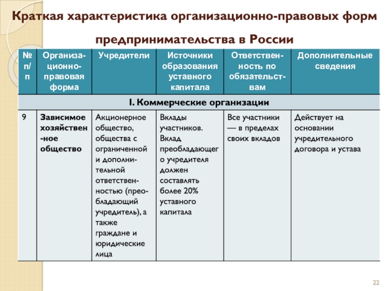 Слайд 22Краткая характеристика организационно-правовых форм предпринимательства в России