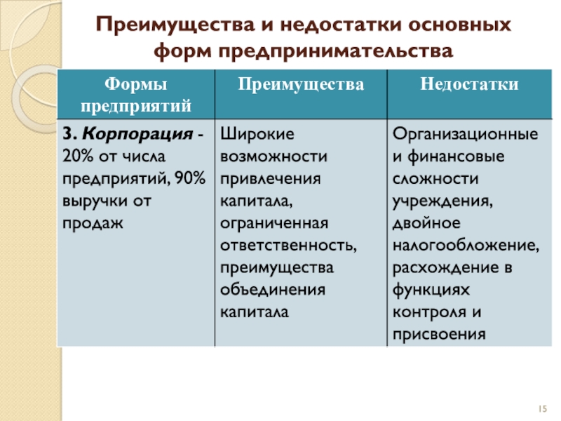 Слайд 15Преимущества и недостатки основных форм предпринимательства