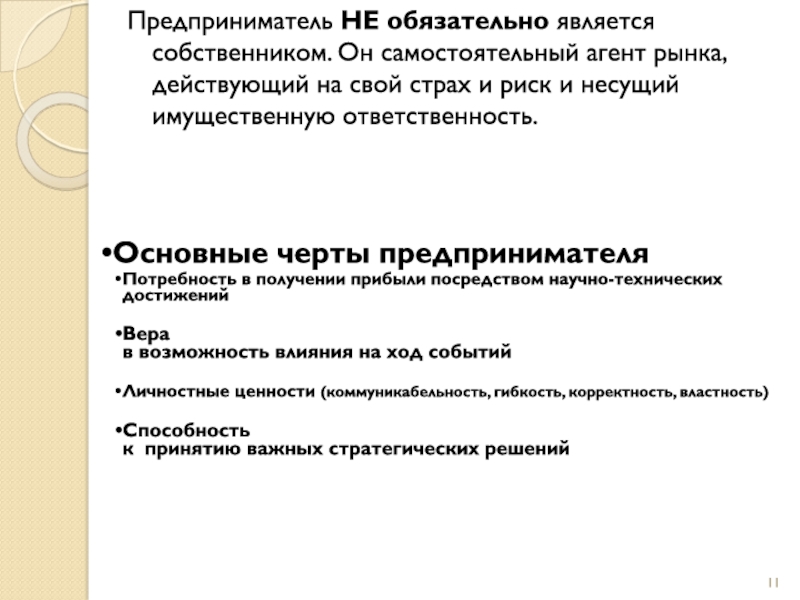 Слайд 11Предприниматель НЕ обязательно является собственником. Он самостоятельный агент рынка, действующий