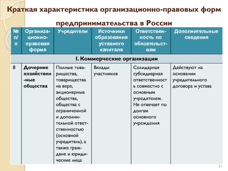 Слайд 21Краткая характеристика организационно-правовых форм предпринимательства в России