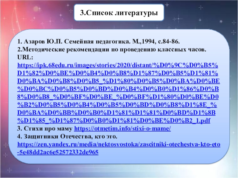 1. Азаров Ю.П. Семейная педагогика. М.,1994, с.84-86.