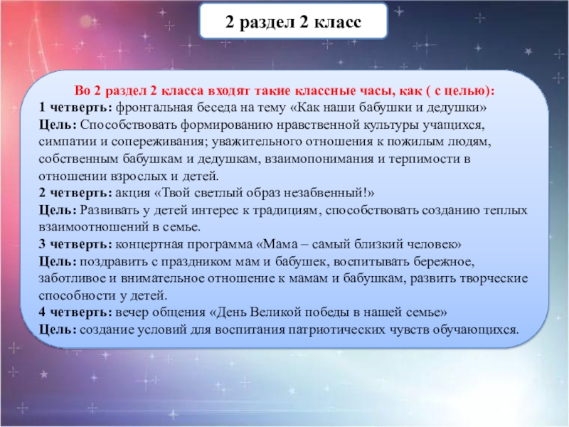 Цель: Способствовать формированию нравственной культуры учащихся, симпатии и сопереживания; уважительного отношения к пожилым людям, собственным бабушкам и дедушкам, взаимопонимания и терпимости в отношении взрослых и детей.
