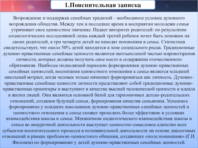 молодежи семья утрачивает свое ценностное значение. Падает авторитет родителей: по результатам социологических исследований лишь каждый третий ребенок хочет быть похожим на своих родителей, а три четверти детей не находят понимания в семье. Статистика свидетельствует, что около 50% детей находится в зоне социального риска. Традиционные духовно-нравственные семейные ценности являются неотъемлемой частью мировоззрения личности, которые должны получить свое место в содержании отечественного образования. Наиболее подходящий периодом формирования духовно-нравственных семейных ценностей, воспитания ценностного отношения к семье является младший школьный возраст, когда человек только начинает формироваться как личность. Духовно-нравственные семейные ценности личности представляют собой традиционные духовно-нравственные ориентиры и выступают в качестве высшей человеческой ценности и идеала в жизни людей. Они являются основной базой для гармоничных детско-родительских отношений, создания будущей семьи, формирования качества семьянина. Успешное формирование у младших школьников духовно-нравственных семейных ценностей и ценностного отношения к семье сможет проходить более эффективно в условиях взаимодействия школы и семьи. Механизмом педагогического взаимодействия школы и семьи во внеурочной деятельности выступает ценностно-смысловое единство всех субъектов воспитательного процесса в познавательной деятельности на основе диалоговых отношений в рамках проблемно-ценностного общения, создающих «поле понимания» (Г.Н. Филонов) по формированию у детей духовно-нравственных семейных ценностей.