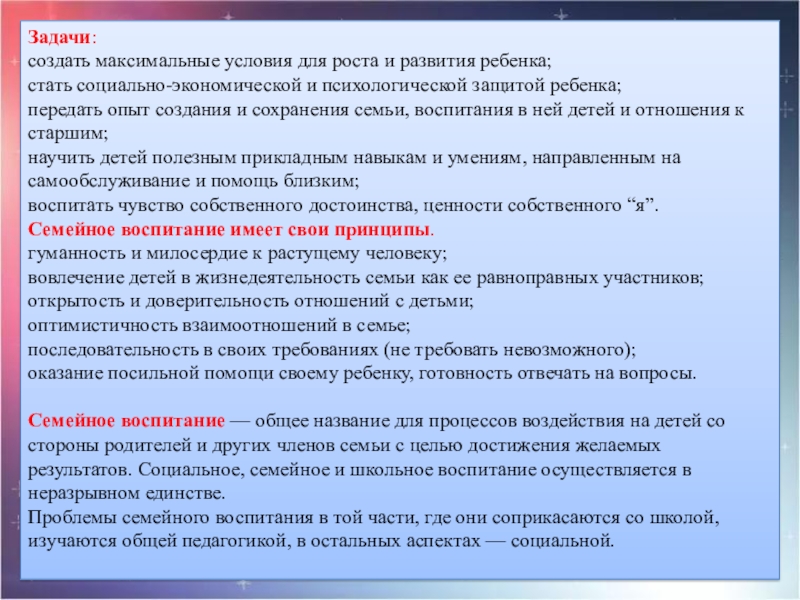 роста и развития ребенка через возрождение семейных традиций, укрепление духовных ценностей семьи, повышение ее интеллектуального и культурного уровня.