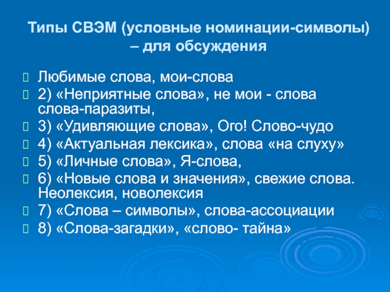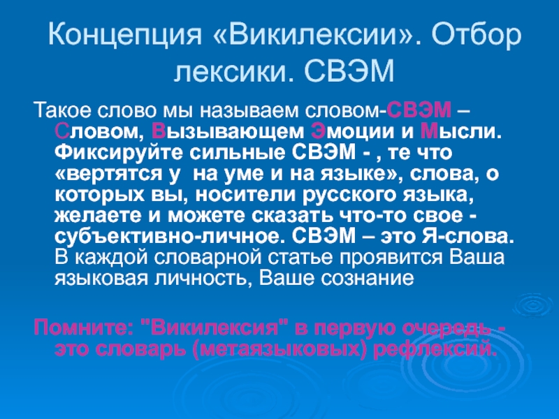 те что «вертятся у на уме и на языке», слова, о которых вы, носители русского языка, желаете и можете сказать что-то свое - субъективно-личное. СВЭМ – это Я-слова. В каждой словарной статье проявится Ваша языковая личность, Ваше сознание
