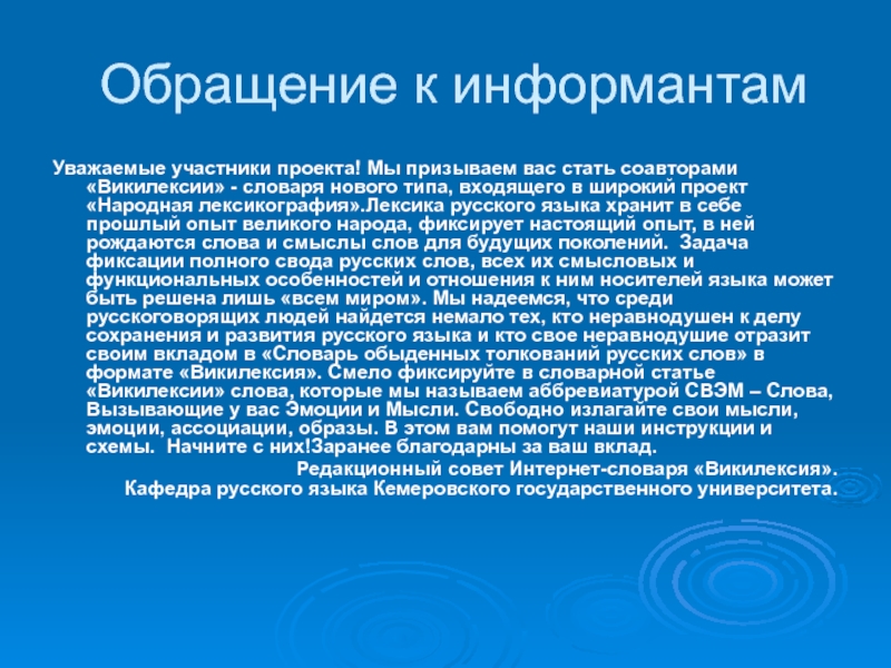 Словарь «Викилексия» отражает своеобразие языкового сознания каждого носителя русского языка и – в целом – всего огромного русскоязычного коллектива. Это достигается тем, что вы, авторы «Викилексии», – а это любой русскоговорящий человек – зафиксируете в словаре интересующее и волнующее вас слово, отразите в словарной статье свое личное отношение к этому слову, раскроете причины вашего неравнодушия и интереса к нему.