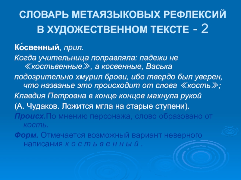 учительница поправляла: падежи не ≪костьвенные≫, а косвенные, Васька