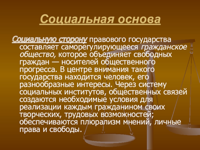 такого государства находится человек, его разнообразные интересы. Через систему социальных институтов, общественных связей создаются необходимые условия для реализации каждым гражданином своих творческих, трудовых возможностей; обеспечиваются плюрализм мнений, личные права и свободы.