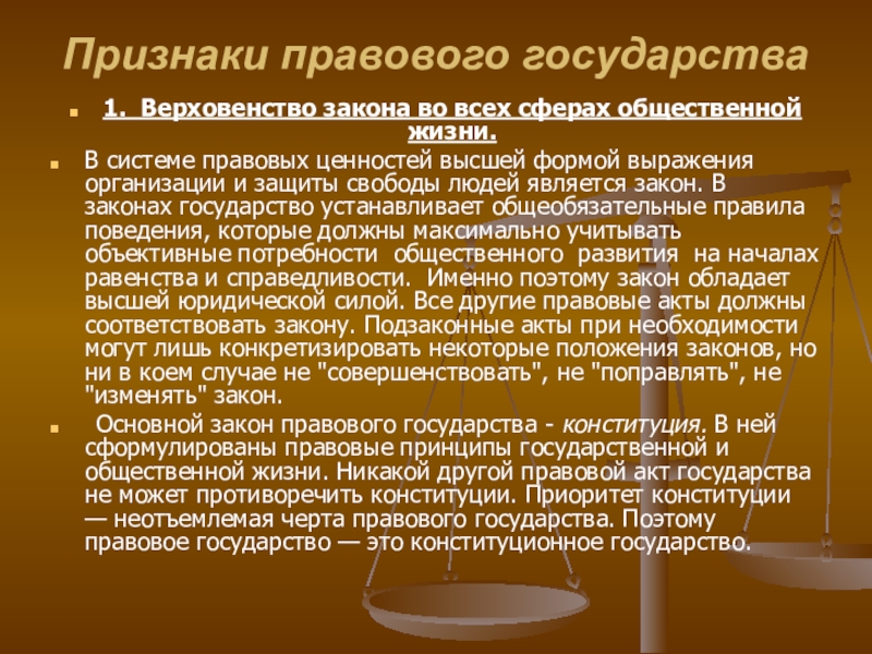 Основной закон правового государства - конституция. В ней сформулированы правовые принципы государственной и общественной жизни. Никакой другой правовой акт государства не может противоречить конституции. Приоритет конституции — неотъемлемая черта правового государства. Поэтому правовое государство — это конституционное государство.