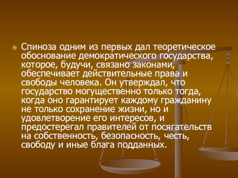 Слайд 7Спиноза одним из первых дал теоретическое обоснование демократического государства, которое,