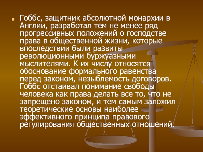 впоследствии были развиты революционными буржуазными мыслителями. К их числу относятся обоснование формального равенства перед законом, незыблемость договоров. Гоббс отстаивал понимание свободы человека как права делать все то, что не запрещено законом, и тем самым заложил теоретические основы наиболее эффективного принципа правового регулирования общественных отношений.
