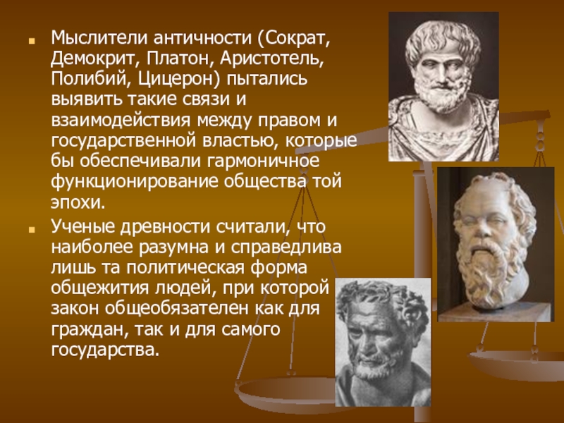 Слайд 2Мыслители античности (Сократ, Демокрит, Платон, Аристотель, Полибий, Цицерон) пытались выявить