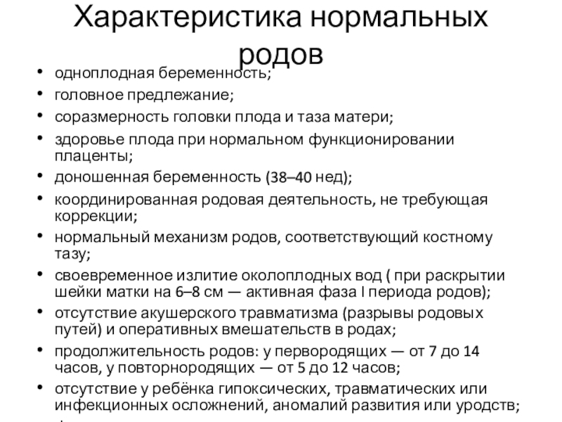 продолжительность родов: у первородящих — от 7 до 14 часов, у повторнородящих — от 5 до 12 часов;